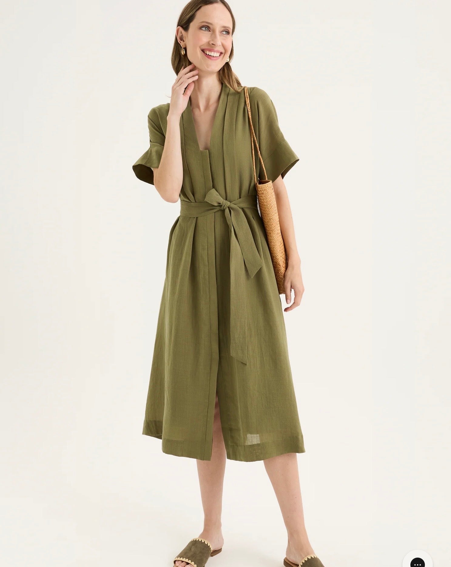 The Mateus Dress offers a considered balance of structure and ease, making it a true investment piece for this year's summer season and beyond. Crafted with a flattering V neckline, it’s defined by artfully placed front tucks that shape the silhouette while maintaining a fluid drape. The extended short sleeves and concealed button closure at the front add clean, understated detail, while the matching green waist tie allows the fit to be worn cinched or relaxed. Lined through the body for comfort and opacity, it also features functional inseam pockets for practicality. Falling to a mid-calf midi length in a semi-fitted, softly flared cut, it’s a versatile dress that feels equally at home styled for work, occasions, or everyday outfitting.
